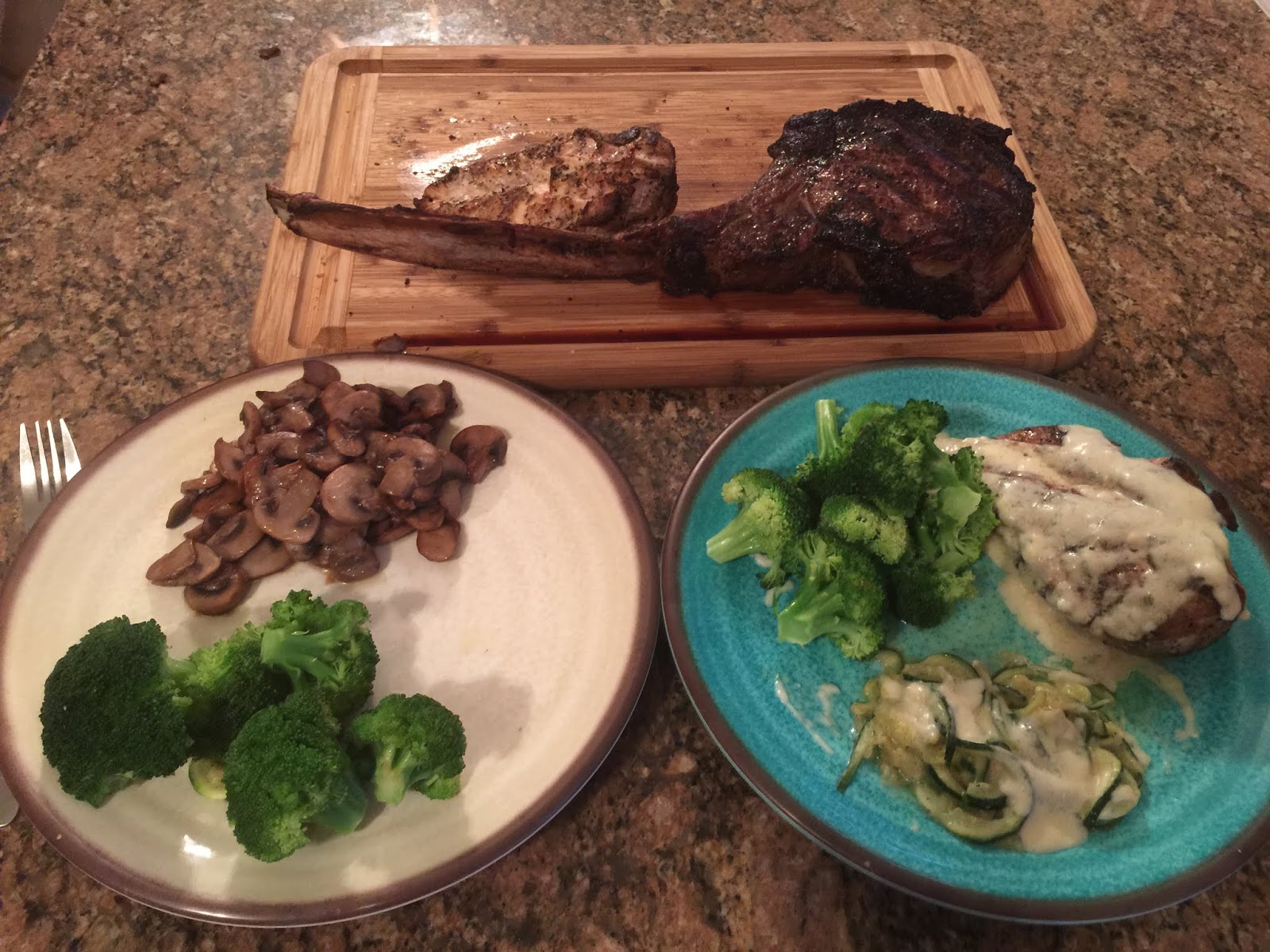 After everyone left, Peter and I worked on dinner together. He was so excited because he had this ridiculously large tomahawk steak that he was just dying to cook. He grilled up some chicken breast for me.